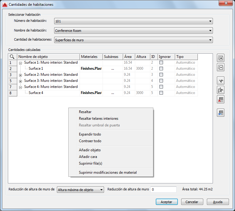 Cuando se lleva a cabo un cálculo de superficies de muro interior para habitaciones individuales, suele ser frecuente que deba considerar techos reflejados, capas de losas adicionales o zócalos (rodapiés) sobre una altura de 10 cm que no se han trazado en el dibujo.