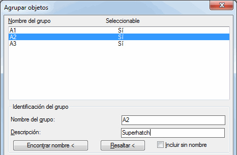 3) Seleccione el grupo. Observe que "superhatch" aparece en el campo de descripción de los grupos creados por SUPERHATCH.