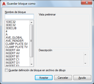 Guarda la definición de bloque como archivo de dibujo. Si se selecciona un archivo de dibujo existente se sobrescribirá el archivo guardado. Por defecto, el archivo de dibujo recibirá el nombre de bloque especificado.