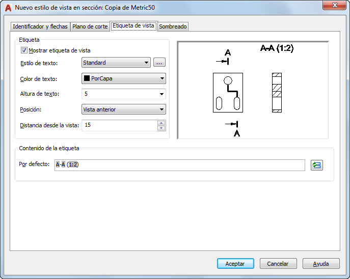 - Define la posición de la etiqueta de vista en sección en relación a la vista en sección.