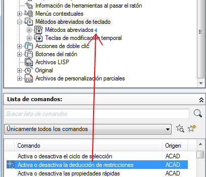 - Para crear un método abreviado, vaya al panel Lista de comandos y arrastre un comando al nodo Métodos abreviados del panel Personalizaciones en <nombre de archivo>.