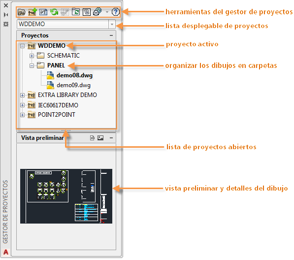 Gestor de proyectos es una paleta que puede permanecer en pantalla incluso mientras se utilizan otros comandos. Se puede acoplar, cambiar de tamaño y ocultar automáticamente.