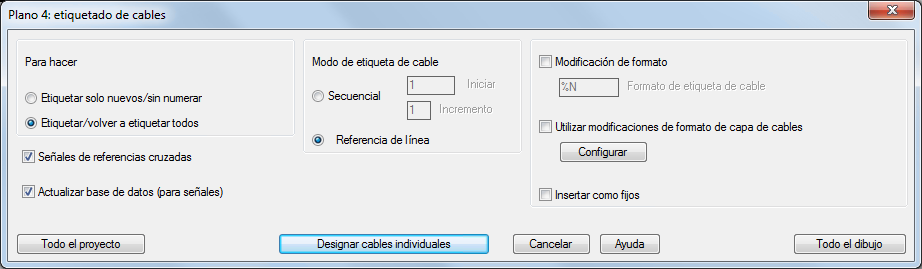 Los parámetros de propiedades del dibujo están preseleccionados, pero se pueden modificar. Los números de cable marcados como "fijos" no se actualizarán cuando utilice el comando Números de cable. Utilice el comando Editar número de cable para marcar un número de cable como "fijo". Buscar