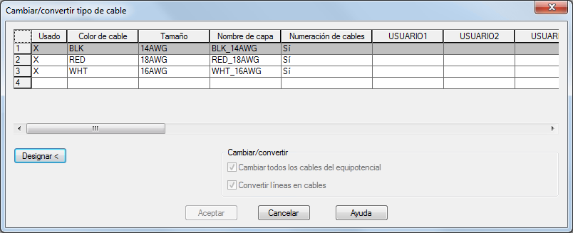 Para crear una capa de cables, introduzca un color y un tamaño de cable en la fila en blanco. El nombre de capa por defecto ya aparece introducido y se puede renombrar según sea necesario. Durante una operación de números de cable, los números de cable se añaden a todas las capas, salvo que se hayan definido como "sin numeración de cables". Esta opción resulta útil en algunos casos como, por ejemplo, con los dibujos unifilares. Use las opciones Color, Tipo de línea y Grosor de línea para definir las propiedades de capas.