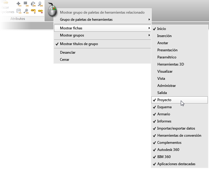 Haga clic con el botón derecho en el área de las fichas y seleccione las fichas que desee mostrar u ocultar.