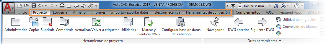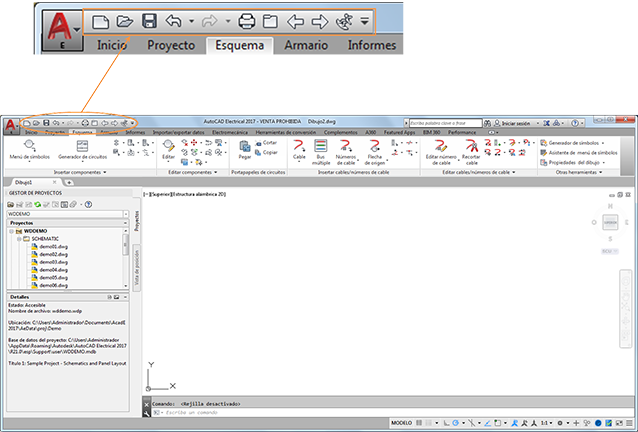 Puede acceder a todas las funciones que se muestran en esta guía desde la cinta de opciones. Además, la barra de herramientas de acceso rápido que se muestra incluye algunos comandos de navegación utilizados en AutoCAD Electrical.