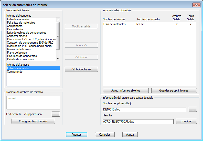 Seleccione el nombre del informe y un archivo de formato (.set) para cada informe que desee ejecutar. Los archivos de formato deben definir la salida de archivo, de tabla o de ambos.