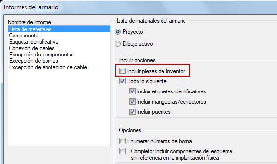 También se ha añadido la opción Incluir piezas de Inventor a la configuración del archivo de formato de informe tanto para los informes de lista de materiales del armario o esquemática.