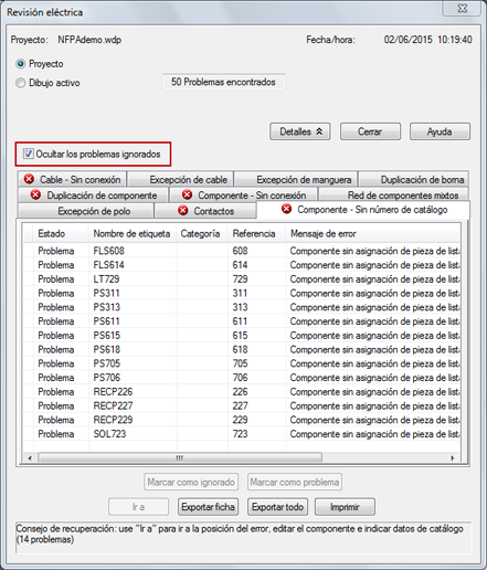 El estado de error se recuerda cada vez que se ejecuta la revisión y en todas las sesiones de AutoCAD Electrical.