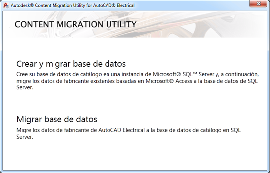 En el modo de implantación, puede conectarse a la instancia de SQL Server, la cual ya ha sido creada por el administrador de su sistema/base de datos. Para crear una instancia de SQL Server, utilice Autodesk Content Migration Utility for AutoCAD Electrical, que es una herramienta que ayuda a crear y migrar la base de datos de Microsoft® Access a Microsoft® SQL™ Server.