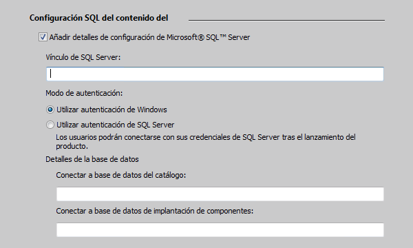 En el modo independiente, puede configurar su SQL Server desde el producto. Utilice el comando AECATALOGCONFIG para abrir el cuadro de diálogo Configurar base de datos, que le permite conectarse y seleccionar las bases de datos de catálogo y de implantación de componentes en una instancia de SQL Server.