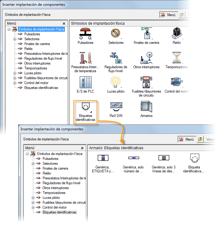 Al insertar una etiqueta identificativa, esta se puede asociar a una implantación física. Los valores de la implantación de componentes, como los de etiqueta, instalación, posición y descripciones, se copian de la implantación de componentes. Sin embargo, se puede asignar un número de elemento y el valor del catálogo específico de la etiqueta identificativa.
