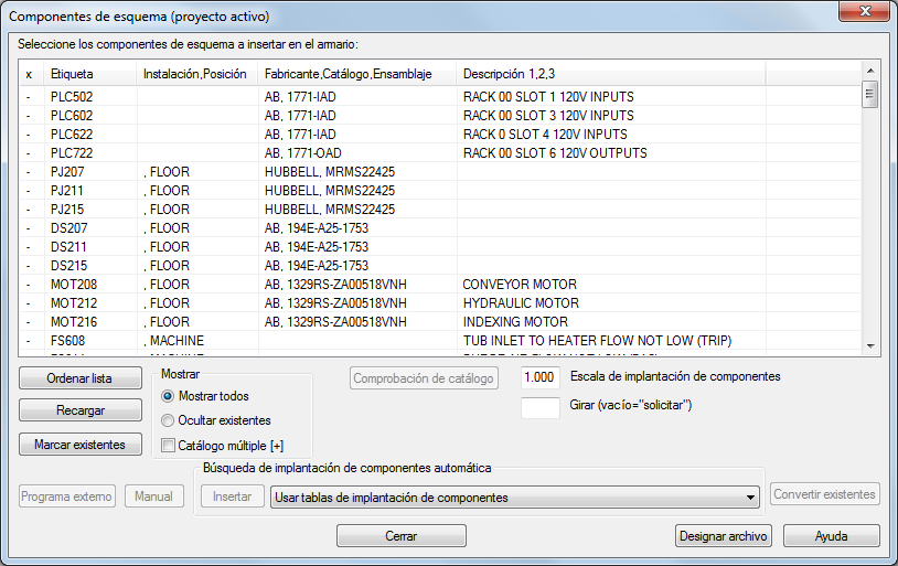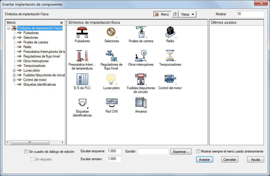 En el caso de los componentes de armario que no se muestran en el esquema, utilice el menú de símbolos del armario para insertar implantaciones físicas. Buscar