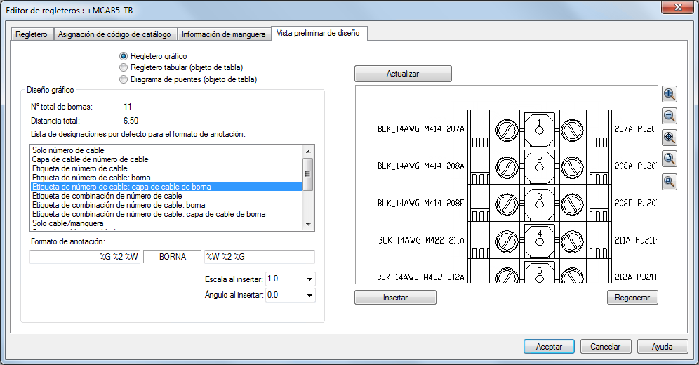 Utilice la ficha Vista preliminar de diseño para insertar el regletero; seleccione el tipo y el estilo de anotación. Use la vista preliminar para asegurarse de que todo está configurado de la forma deseada.