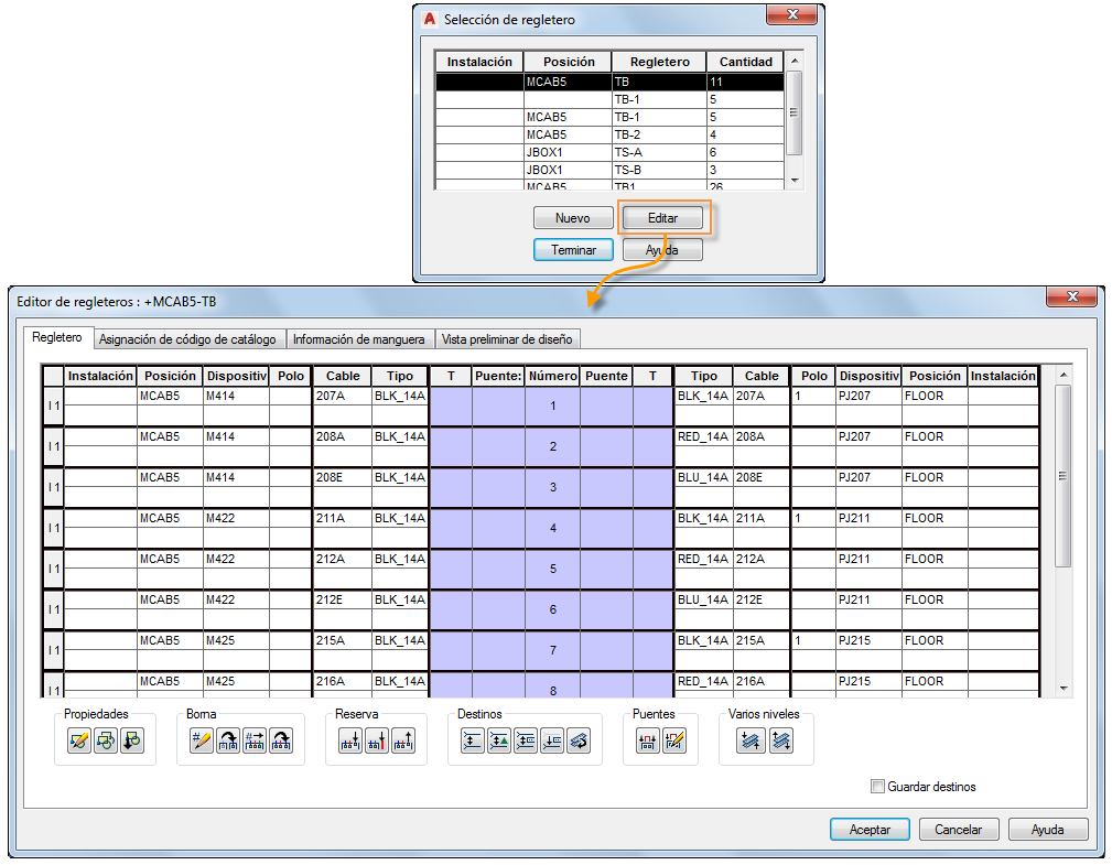 El editor de regleteros permite gestionar regleteros completos en lugar de bornas de una en una. Buscar