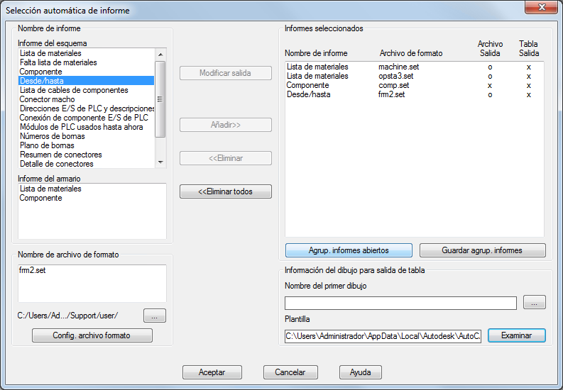 Con la opción Informes automáticos, se selecciona un grupo de informes y un archivo de formato para cada informe. Los informes no se muestran en la pantalla. Cada archivo de formato debe generar el informe en un archivo, insertarlo como una tabla, o ambas cosas. Los nuevos dibujos se añaden al proyecto para las tablas nuevas.