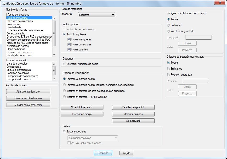 Utilice este cuadro de diálogo para predefinir las opciones del informe, la configuración de los campos, la configuración de las tablas del informe, los parámetros del archivo de salida, etc. Las opciones del informe pueden ser diferentes en función del tipo de informe seleccionado.