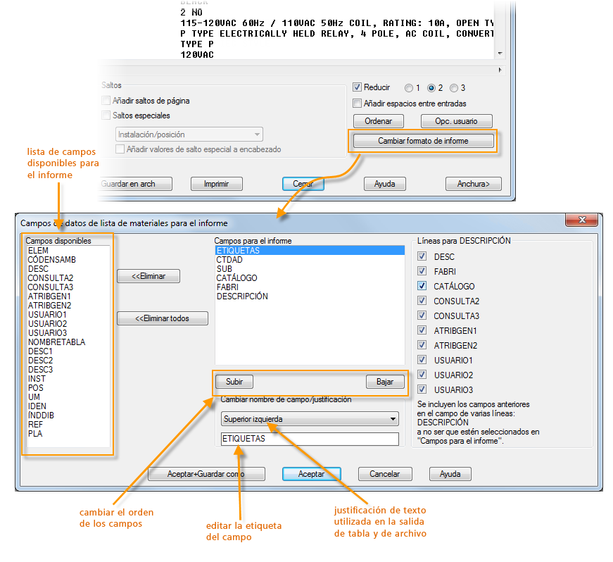 Después de ejecutar el informe, se pueden incluir y excluir campos, así como cambiar su orden y sus etiquetas.