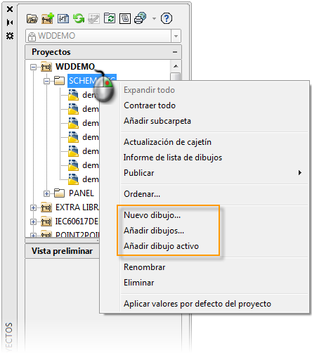 Añada dibujos existentes a un proyecto activo en cualquier momento. Esta opción resulta útil si desea volver a utilizar los dibujos de un proyecto anterior. Para añadir o crear dibujos en una carpeta específica, haga clic con el botón derecho en el nombre de la carpeta en el Gestor de proyectos y seleccione la opción de dibujo.