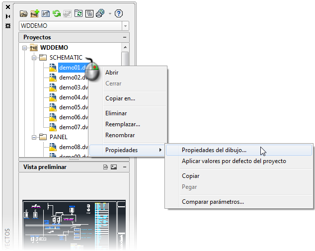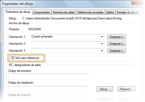 Es posible que existan dibujos que forman parte del proyecto pero que no desea que se procesen durante la ejecución de funciones de todo el proyecto. También es posible que no sean dibujos eléctricos, pero sean necesarios para el diseño completo. Puede definir estos dibujos como referencia solo en las propiedades del dibujo.