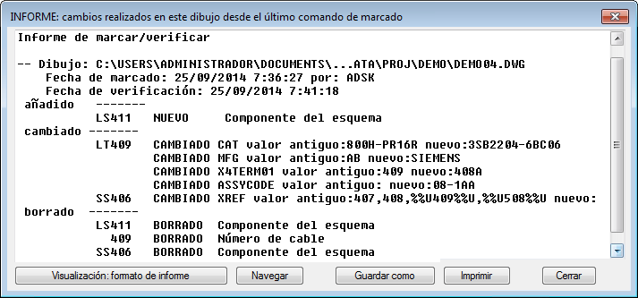 Si desea ver los cambios realizados después de dicho punto, ejecute el mismo comando y seleccione la opción Verificar. Se muestra un informe de todos los cambios que se puede imprimir o utilizar para navegar hasta los objetos modificados.