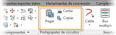 Los comandos Copiar o Cortar insertan los componentes y cables en el portapapeles de circuitos. Utilice el comando Pegar para insertar los objetos en el dibujo activo o en otro dibujo. Es posible que sea necesario actualizar los números de borna, ya que este comando no permiten incrementar los números de borna.