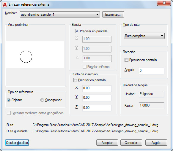 Muestra la ruta que se guarda con el dibujo al enlazar la referencia externa. La ruta depende del parámetro Tipo de ruta.