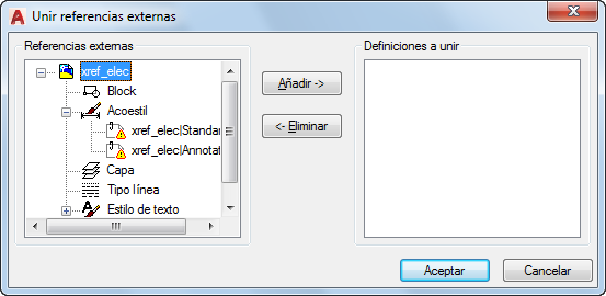 Fusiona en el dibujo actual objetos guardados dependientes de referencias externas (como bloques, estilos de cota, capas, tipos de línea y estilos de texto).