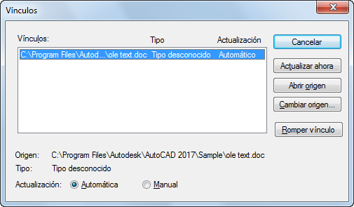 Rompe el vínculo entre el objeto y el archivo origen. El objeto del dibujo cambia a WMF (formato de metarchivo de Windows), al que no afectarán los futuros cambios en el archivo original.