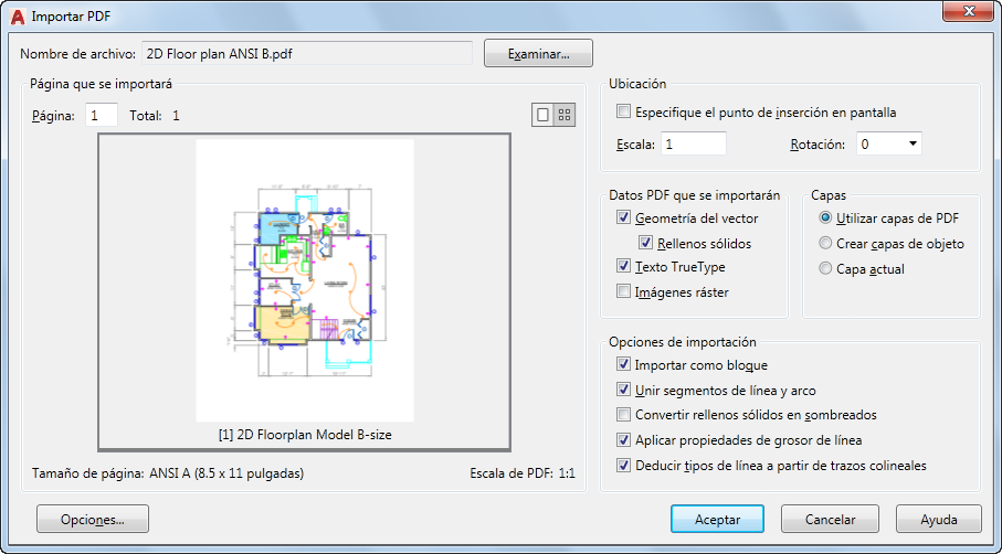 - Puede especificar otro factor de escala de importación para los objetos importados. La importación de una página de un archivo PDF no utiliza el ajuste de la variable de sistema INSUNITS, ya que cada página puede estar en una escala distinta.