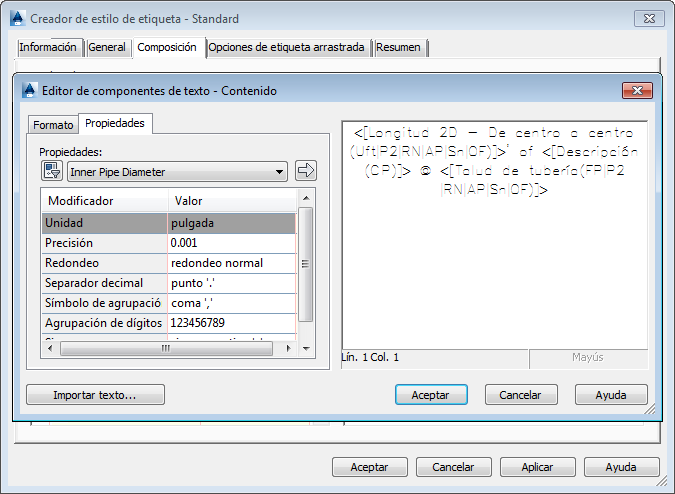 El siguiente paso consiste en crear un estilo de etiqueta de tubería para la planta y el perfil que muestre este valor de caudal. En la figura 12 se muestra un ejemplo de este estilo de etiqueta, con los parámetros hidráulicos correspondientes: