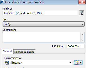 Cuando se crea una alineación mediante los cuadros de diálogo Crear alineación - Composición o Crear alineación - A partir de polilínea, el valor por defecto crea la alineación sin ningún emplazamiento especificado (<Ninguno>), tal como se muestra en la figura 2.
