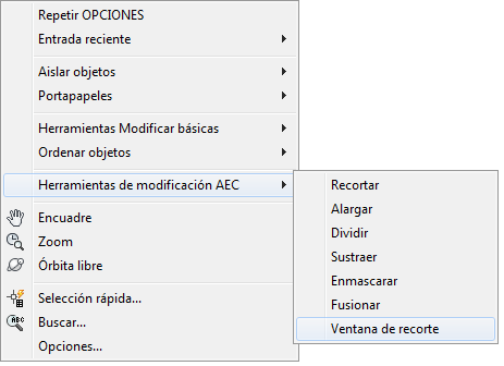 Antes de añadir datos de polilíneas de curvas de nivel a una superficie, valore si incluye algún terreno que no sea necesario para el diseño. Si es así, puede usar las herramientas de modificación AEC para recortar las partes no deseadas de las curvas de nivel. Como se muestra en la figura 5, estas herramientas están disponibles en el menú contextual cuando no hay ningún objeto seleccionado en el dibujo.