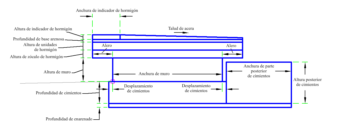 Los componentes de plataforma ferroviaria de Muro, Zócalo de hormigón, Unidades de hormigón, Base arenosa, Indicador de hormigón, Acera, Cimientos, Enarenado y Parte posterior de cimientos se calculan y colocan en función de los valores de parámetros de entrada indicados.