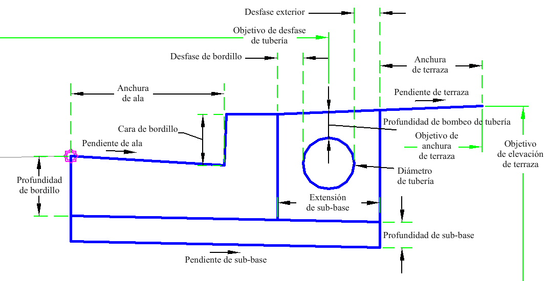 En modo de diseño, este subensamblaje muestra los componentes de caz y bordillo, tubería y terraza en función de los parámetros de entrada especificados.