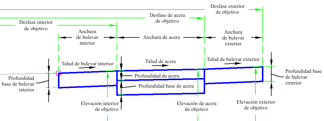 | Anchura de bulevar interior | Se puede utilizar para modificar el valor fijo de la anchura del bulevar interior y asociar el borde interior de la acera a un desfase de alineación. Los tipos de objeto siguientes se pueden utilizar como destinos para especificar este desfase: alineaciones, polilíneas, líneas características o representaciones topográficas. | Opcional |