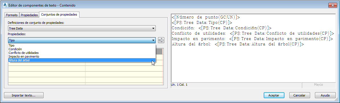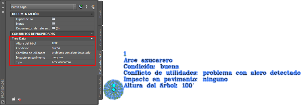La siguiente ilustración muestra un punto etiquetado con datos de árbol configurados en un conjunto de propiedades.
