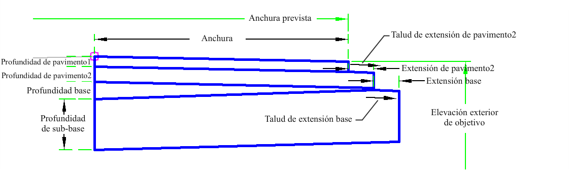 La rasante del arcén se inserta según la anchura de arcén determinada y el talud de arcén por defecto fuera del punto de enlace. Después, se trazan los puntos y los vínculos de Pavimento2. Se proporciona una extensión de Pavimento2 mediante los parámetros de entrada. Los puntos y vínculos de Base, incluida la extensión, se calculan mediante los parámetros de entrada. Los puntos y vínculos de Sub-base, incluida la extensión, se calculan mediante los parámetros de entrada.