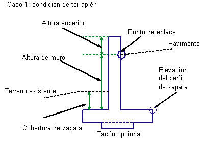 | Cobertura de zapata | Profundidad de cobertura desde la parte superior de la zapata hasta la rasante en el lado posterior del muro en terraplén o hasta el enganche en desmonte. | Numérico |