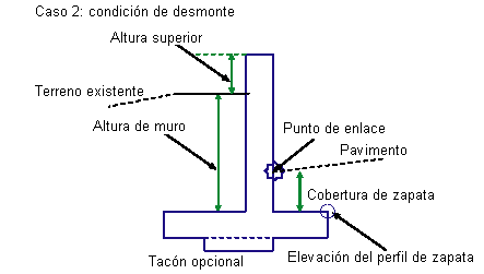 El punto de enlace varía en función de si el muro de contención se encuentra en condición de desmonte o de terraplén. Si es de terraplén, el punto de enlace se encuentra cerca de la parte superior del muro de contención. Si es de desmonte, el punto de enlace se encuentra cerca de la zapata.