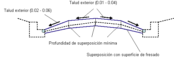 Si los vínculos de superposición son demasiado poco profundos, la profundidad de la superposición se incrementa para alcanzar los taludes mínimos. Si esto da como resultado una diferencia máxima de pendiente excesiva, pueden producirse nuevos ajustes y operaciones de fresado. El siguiente diagrama explica el caso de superposición con fresado: