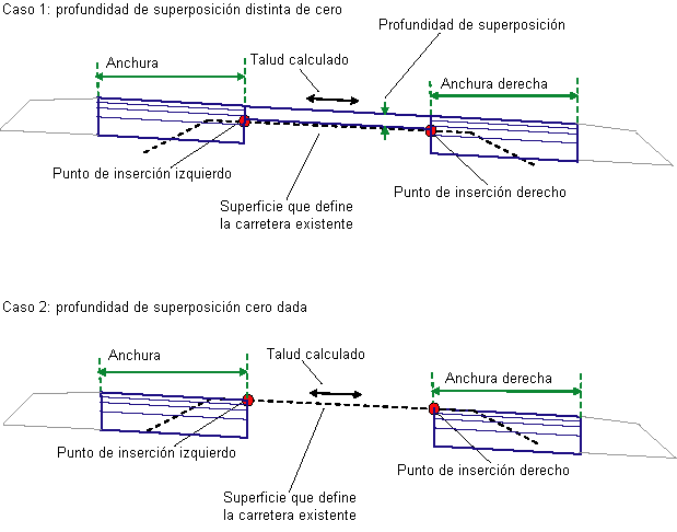 Se determinan las elevaciones de los puntos de inserción izquierdo y derecho en la superficie existente y se calcula el talud entre los dos puntos. Si se especifica una profundidad de superposición distinta de cero, se añade una capa de superposición por encima del carril existente con el talud calculado. Se crea una forma de superposición cerrada mediante la superposición de uno o varios vínculos sobre la pendiente existente. Los carriles de ensanchamiento se insertan hacia fuera de los bordes de superposición para las anchuras dadas con el talud calculado.