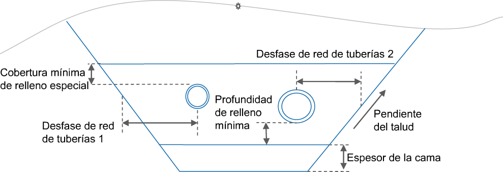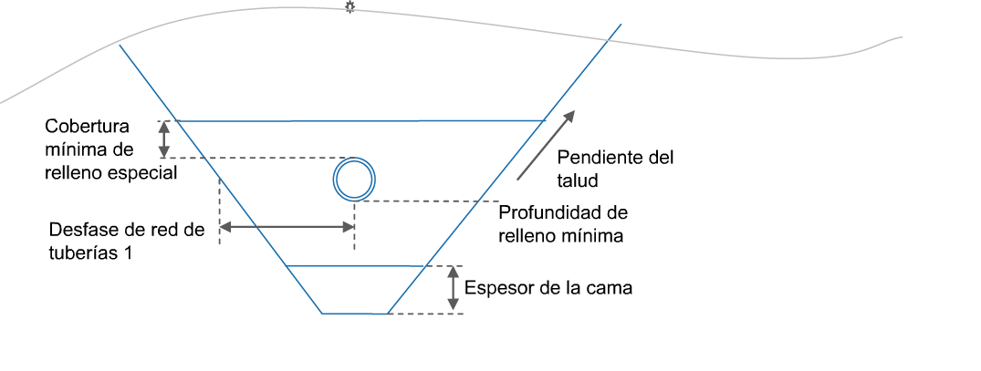 | Desfase de red de tuberías 1 | Desfase desde el borde exterior de la tubería hasta la pendiente del talud de la zanja | Numérico, positivo | 0.0 |