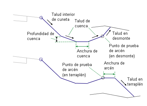 El subensamblaje construye los vínculos para la cuenca y su talud interior de cuneta a partir del punto de prueba de la cuenca. Si se indica un perfil, la anchura del talud interior de cuneta cambiará para mantener el perfil de la cuenca mientras que la profundidad de cuenca permanecerá constante. Si el punto de prueba de la cuenca está en desmonte, la interceptación de intersección se calculará sobre la superficie de objetivo con el talud en desmonte indicado. Si está en terraplén, se añadirá un vínculo en la parte superior de la berma y la interceptación de intersección se calculará sobre la superficie de objetivo con el talud en terraplén indicado. El vínculo de intersección no se inserta si Omitir vínculo de intersección se establece en verdadero. Si el vínculo en la parte superior de la berma interseca la superficie de objetivo, la sección terminará en la intersección.