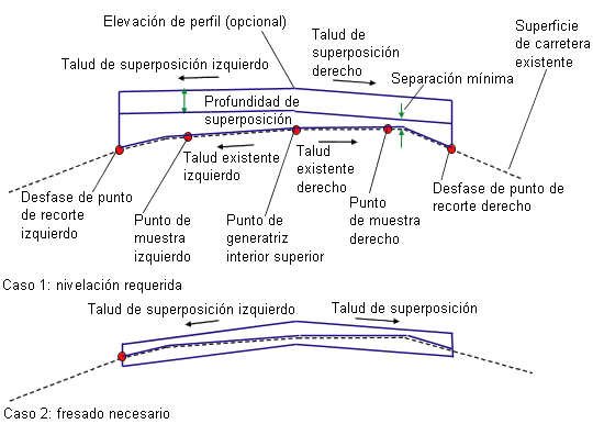 Verticales desde la superficie existente hasta la parte inferior de la superposición: Level: para el caso de nivelación. Mill: para el caso de fresado. |