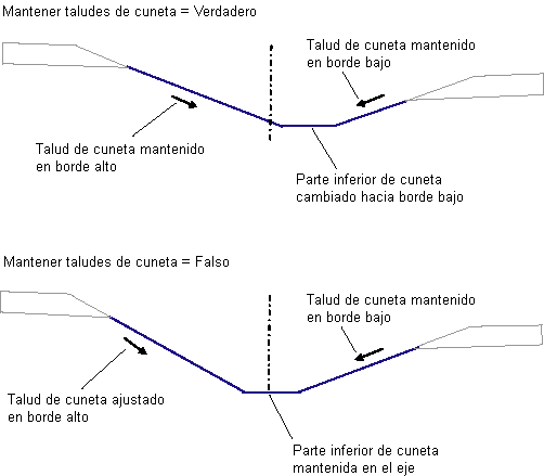 Las partes superiores de los taludes de la cuneta pueden estar a diferentes elevaciones en los lados izquierdo y derecho, lo que da como resultado una cuneta asimétrica. Existen dos opciones para resolver esta situación. Si Mantener talud de cuneta se ha definido como Verdadero, los valores de Talud 1 y Talud 2 se mantienen en los dos lados y la parte inferior de la cuneta se desplaza alejándose del eje hacia el lado inferior. Si se ha definido como Falso, la parte inferior de la cuneta se centra en torno al desfase del punto medio entre las partes superiores de los taludes, el talud dado se mantiene en el lado inferior y el talud se ajusta para hacerlo coincidir en el lado superior.