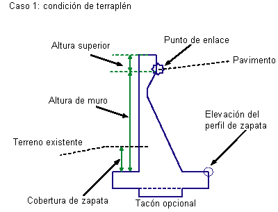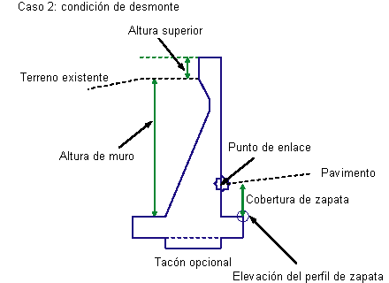 En condición de terraplén, la cara del muro en talud se dirige al centro de la carretera. En condición de desmonte, la cara del muro en talud se encuentra fuera de la carretera, hacia el terreno retenido. Si la opción Tacón se establece en No, la base de la zapata es un vínculo horizontal simple. Si se ha utilizado la opción Tacón, se crearán vínculos que definan el tacón opcional.