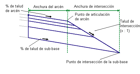 | Tipo de intersección de sub-base | Seleccione si desea mantener el vínculo de intersección en un talud fijo con una anchura variable o en una anchura fija con un talud variable | Lista de selección: a) Mantener talud, ajustar anchura, b) Mantener anchura, ajustar talud | Mantener talud, ajustar anchura |