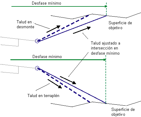 En caso necesario, el talud se ajusta para mantener el vértice por encima de un desfase mínimo desde la línea base.