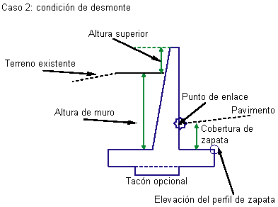 El punto de enlace varía en función de si el muro de contención se encuentra en condición de desmonte o de terraplén. Si es de terraplén, el punto de enlace se encuentra junto a la parte superior del muro de contención. Si se ha insertado en condición de desmonte, el punto de enlace se encuentra cerca de la zapata.